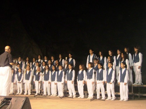 Στιγμιότυπο από την τελευταία χορωδιακή Συνάντηση (2009) που πραγματοποιήθηκε στο εξαιρετικό από πλευράς τοπίου και ηχητικής, λατομείο “Αργυρώ”. Μάταια εκπαιδευτικοί και δημότες περιμένουν από τον δήμαρχο Ιγνάτιο Καϊτεζίδη, να μεριμνήσει ώστε να ξαναγίνει η Συνάντηση στη μοναδική αυτή τοποθεσία που αποτελεί και το φυσικό της χώρο