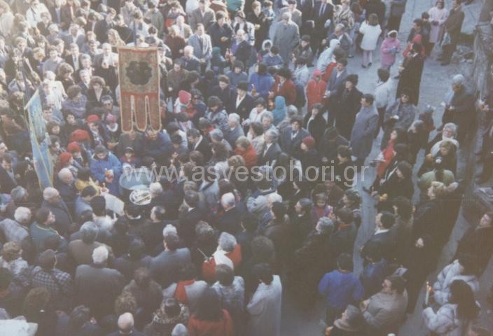 Παλιότερα, μέχρι το 1968, η τελετή του αγιασμού των υδάτων στο Ασβεστοχώρι, γίνονταν στην πλατεία “Μπαχτσέ”, η οποία ήταν η μεγαλύτερη του χωριού (εκεί όπου βρίσκονται σήμερα οι πολυκατοικίες). Από την εκκλησία μετέβαιναν οι πιστοί με εικόνες και εξαπτέρυγα στη συγκεκριμένη πλατεία, όπου είχε στηθεί ένα ξύλινο βαρέλι και σ΄ αυτό γίνονταν ο αγιασμός των υδάτων. Το βαρέλι το γέμιζαν οι ανύπαντρες κοπέλες για να έχουν, όπως έλεγαν, “καλό τυχερό”. Τη νύχτα της παραμονής γίνονταν ένα πραγματικό πανηγύρι, το οποίο οι νέοι και οι νέες περίμεναν όλο το χρόνο και διασκέδαζαν ποικιλοτρόπως. Την ώρα που οι κοπέλες γέμιζαν από τις γειτονικές δημόσιες βρύσες το βαρέλι νερό με γκιούμια, οι νέοι… έκλεβαν πουρνάρια από τις αυλές γειτονικών σπιτιών και άναβαν φωτιές γύρω από τις οποίες, όλοι και όλες μαζί, χόρευαν και τραγουδούσαν. Πολλές φορές κάποιοι νεαροί στο πλαίσιο της διασκέδασης, άδειαζαν το βαρέλι οπότε τα κορίτσια αναγκάζονταν να το ξαναγεμίσουν, χωρίς όμως να δυσανασχετούν γιατί η ατμόσφαιρα ήταν γιορτινή.